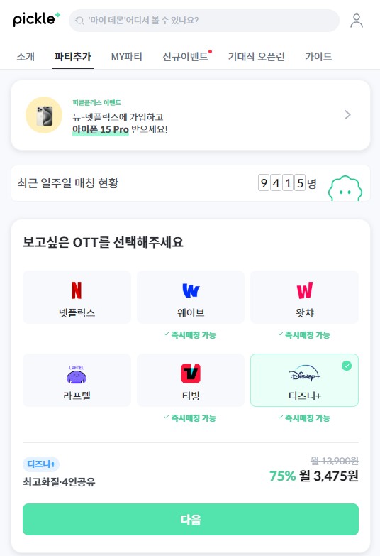 피클플러스는 OTT 계정 공유를 도와주는 사이트로 계정주인이 아이디를 공유해주면 그 아이디로 요금제를 n으로 나누어 낼 수 있습니다. 피클플러스에서 현재 디즈니+ 프리미엄 요금제는 한달에 3,475원에 사용가능합니다.