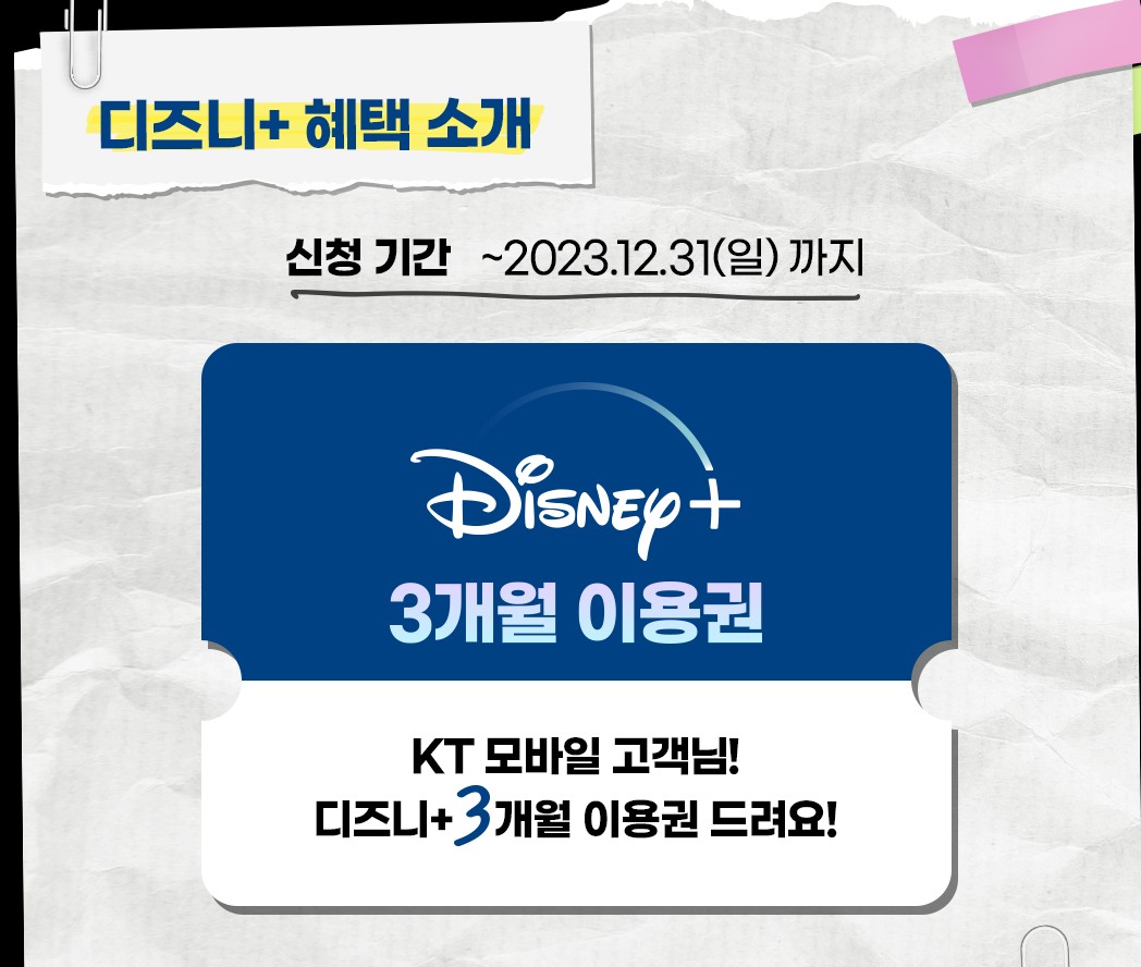 KT 모바일 이용 고객을 대상으로 디즈니플러스 3개월 이용권을 증정하는 이벤트를 진행 중입니다. 아래 사진을 누르시면 상세페이지로 접속가능합니다.